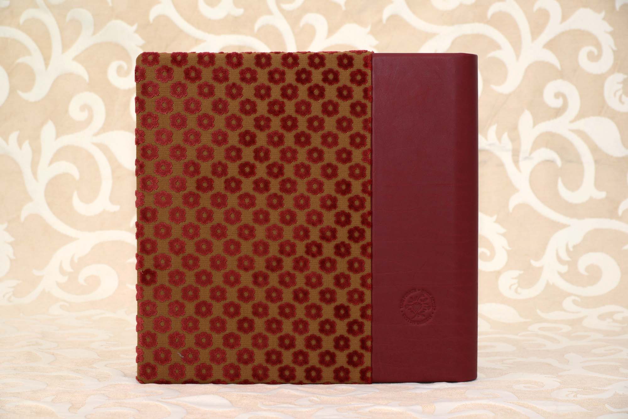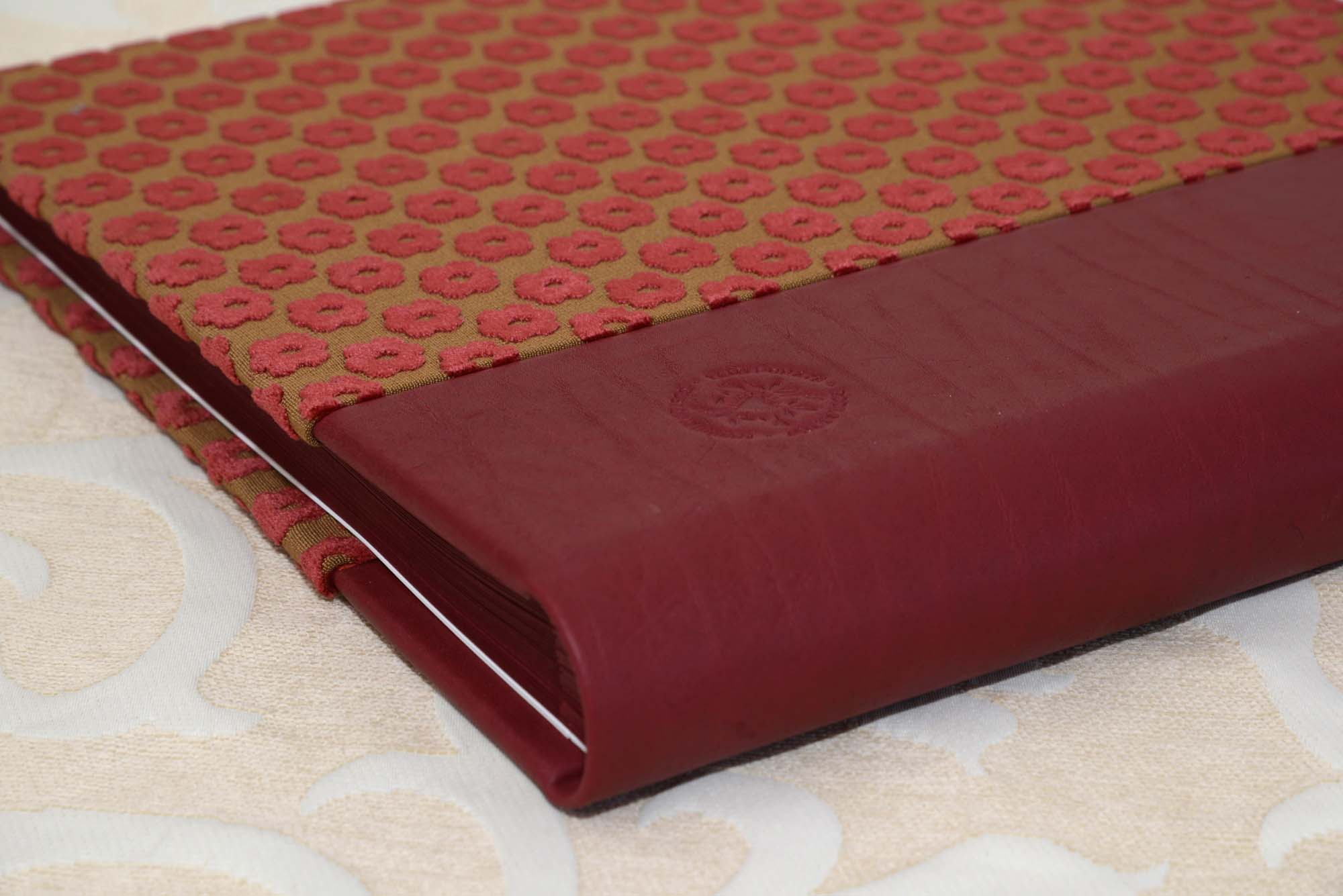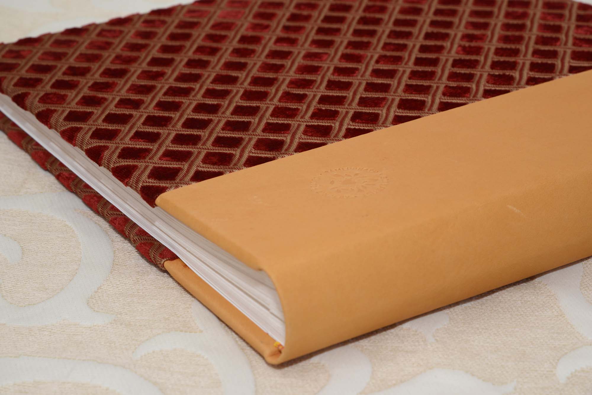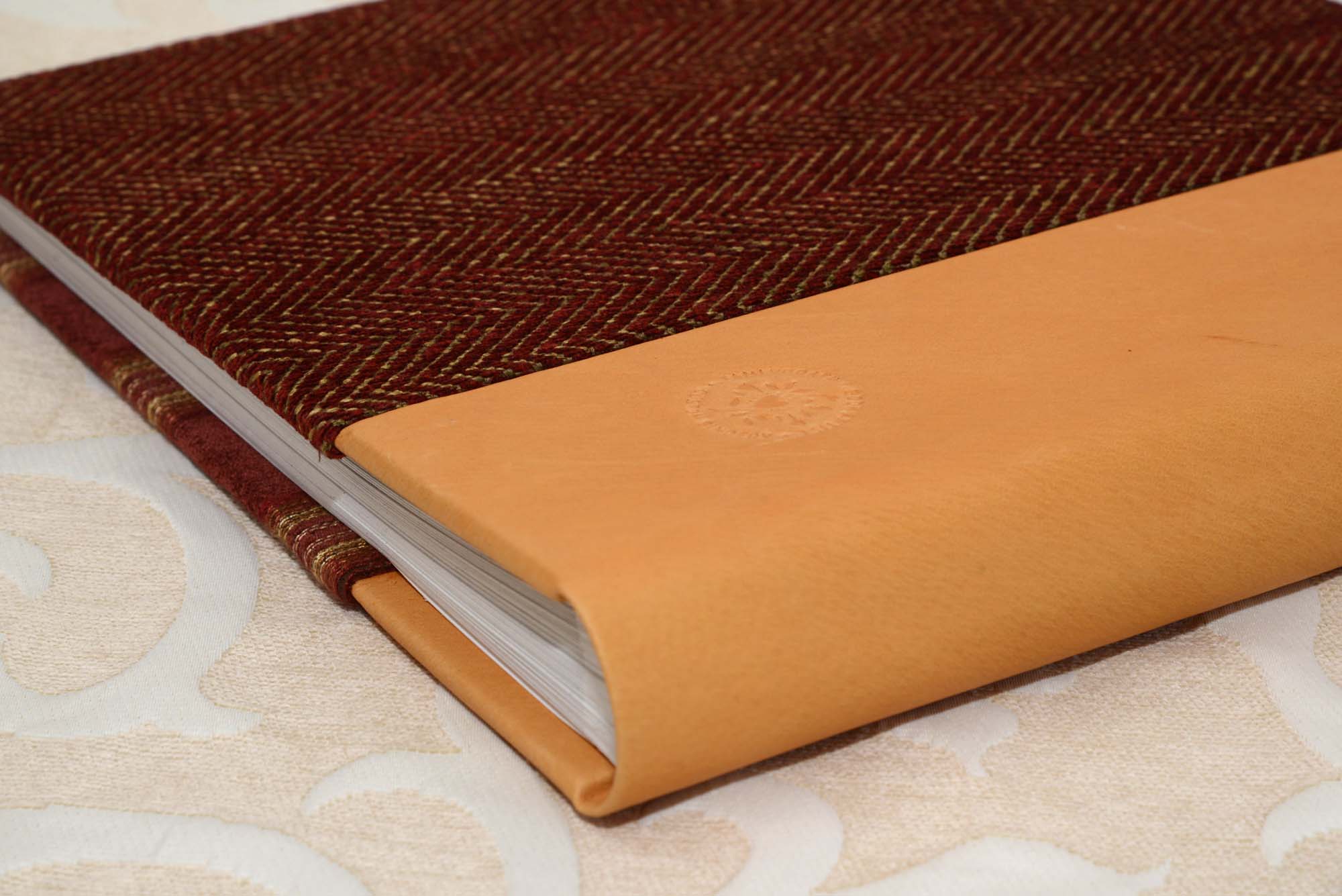 אלבום בורדו עם שידרה מעור צהוב, נייר לבן נוצץ ופרגמנט צהוב כמו השידרה