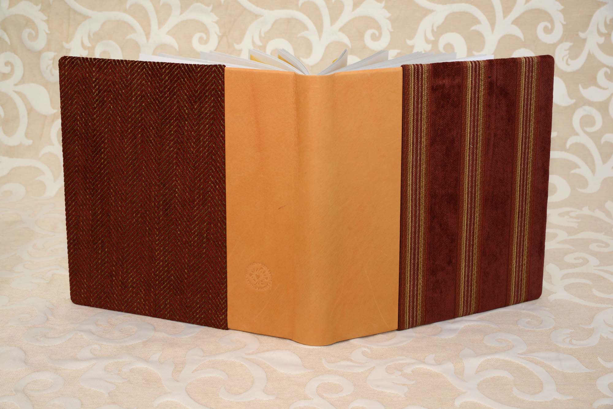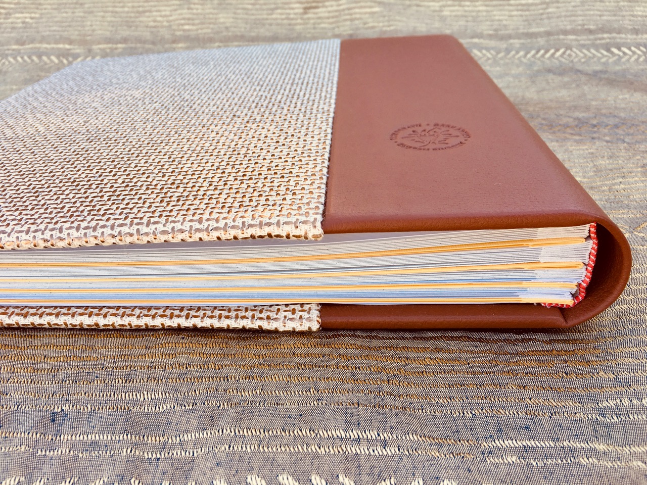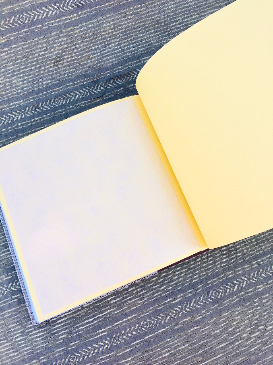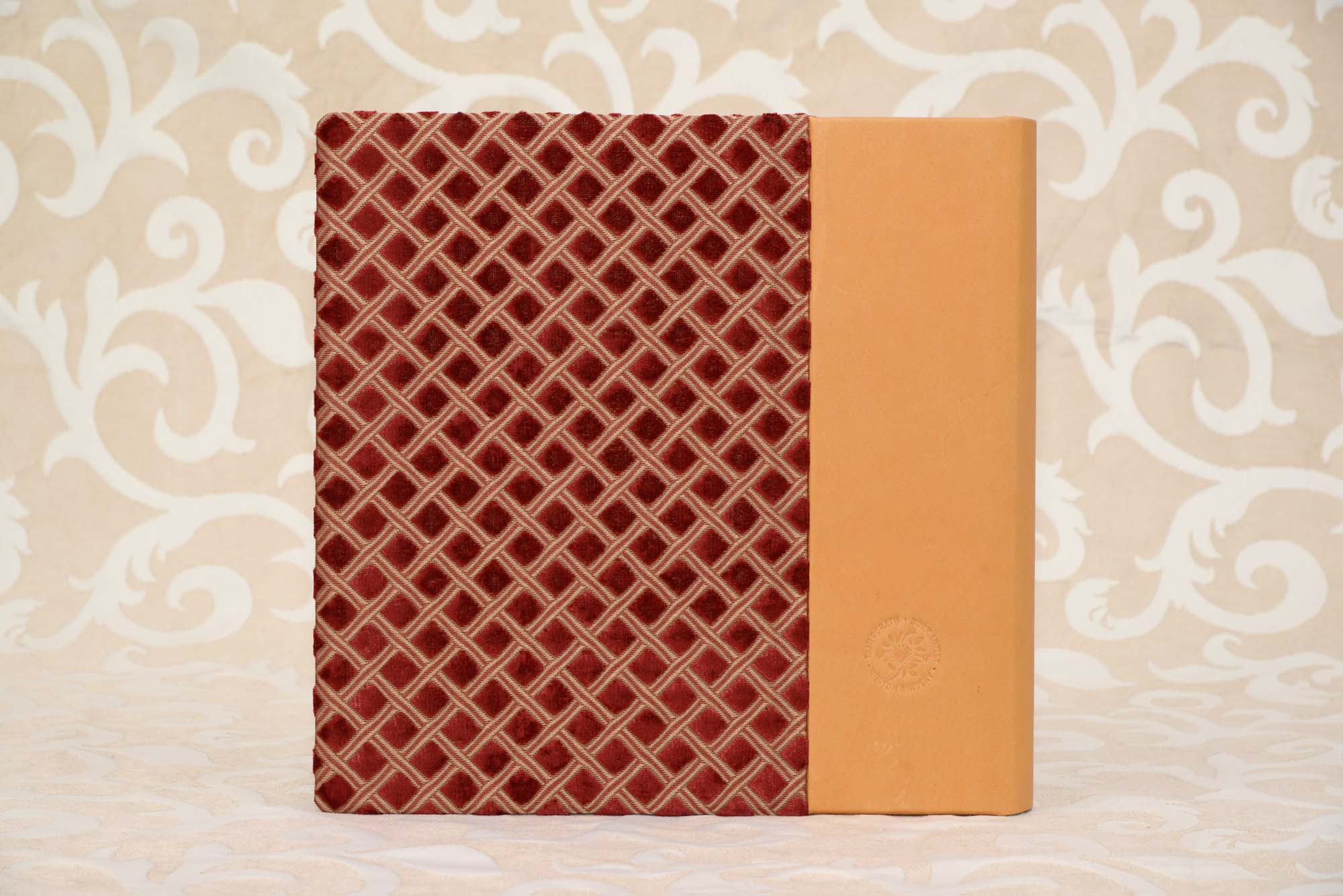 אלבום בורדו עם שידרה מעור צהוב, נייר לבן נוצץ ופרגמנט צהוב כמו השידרה