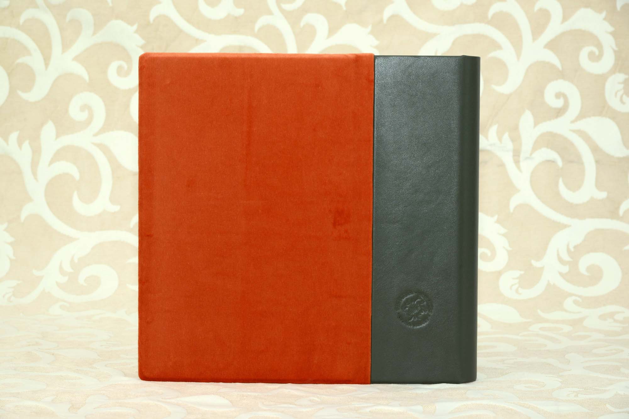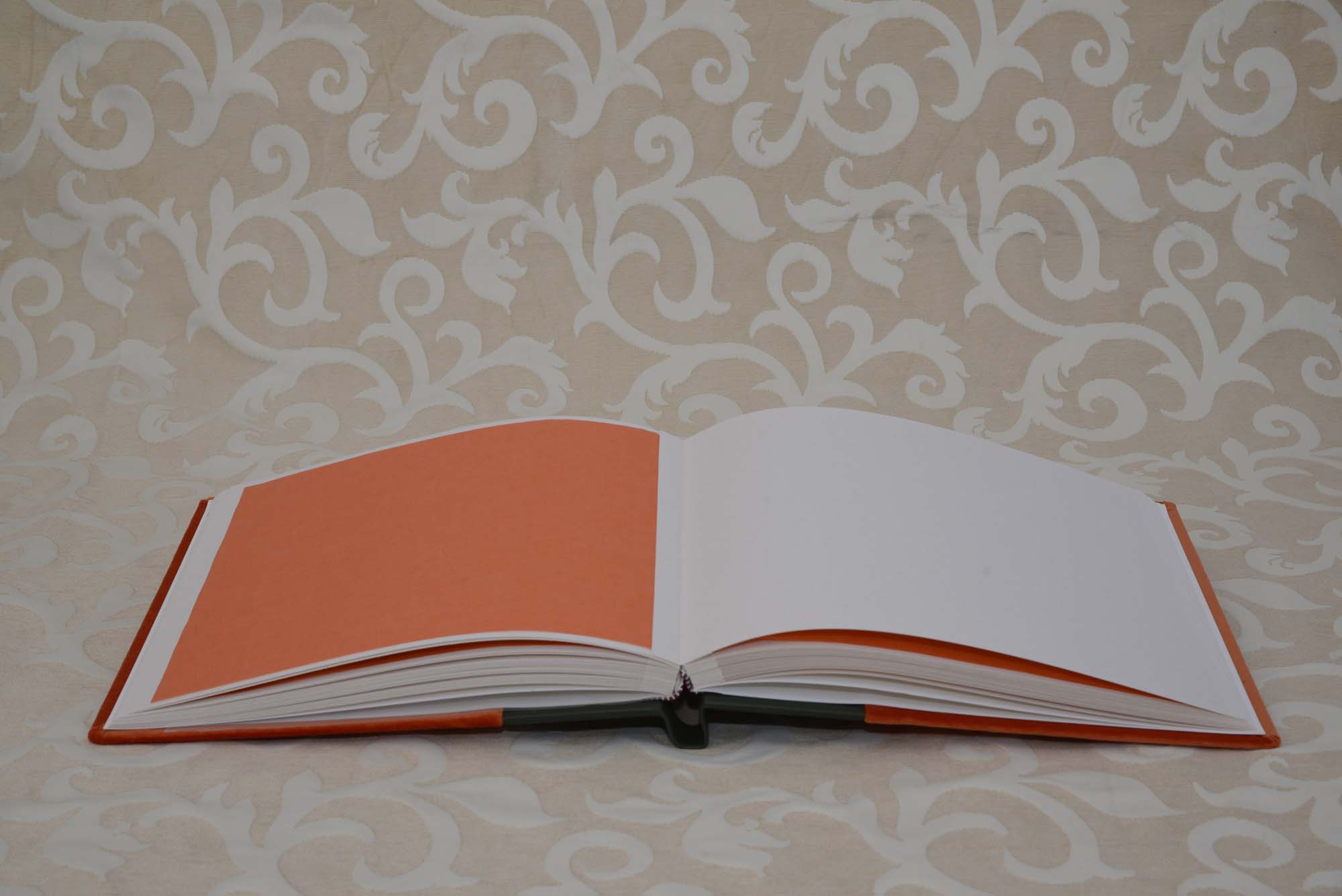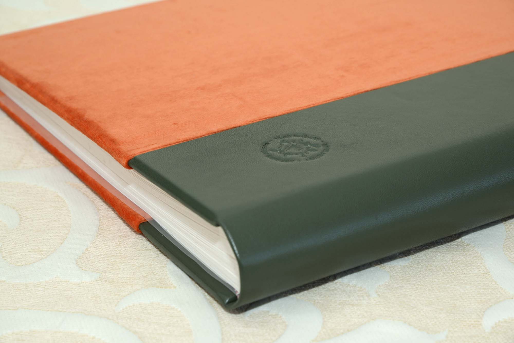 אלבום חתונה קטיפה בצבע כתום ועור ירוק, 40 דפים לבנים עם נצנצים, פרגמנט כתום שמתאים לכריכה,