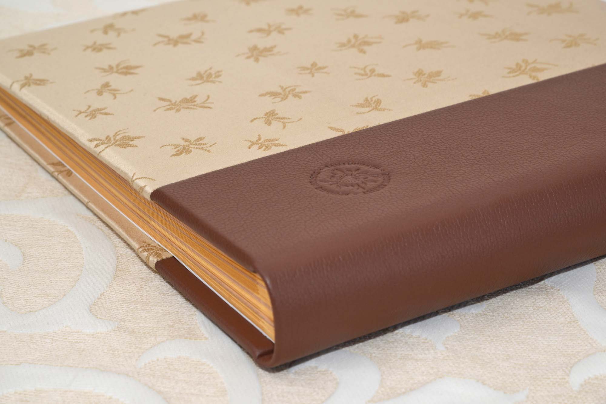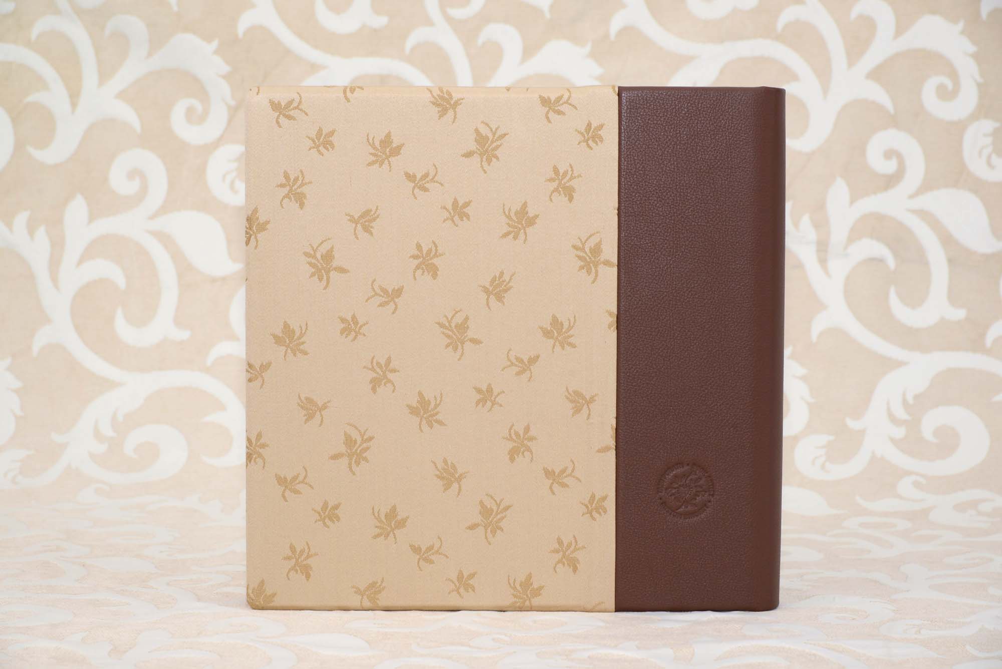 אלבום חתונה עם עור חום בשידרה ובחזית ובגב בד לבן עם דוגמא מוזהבת