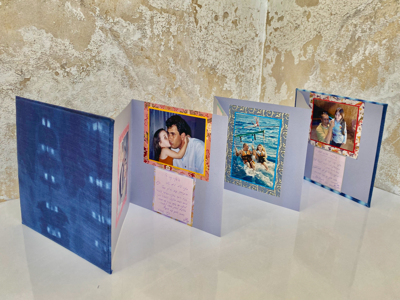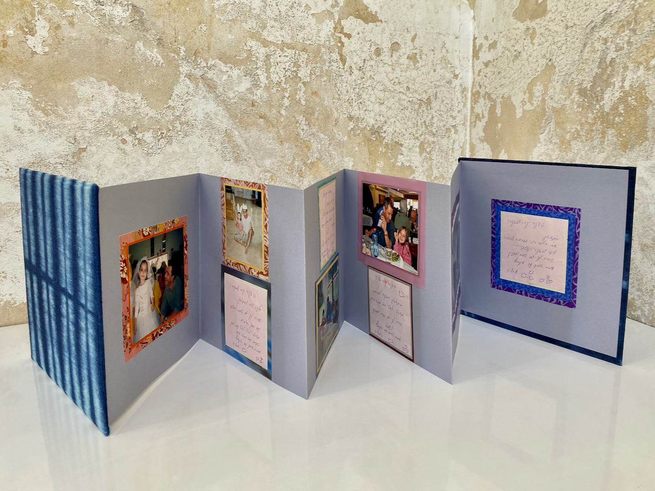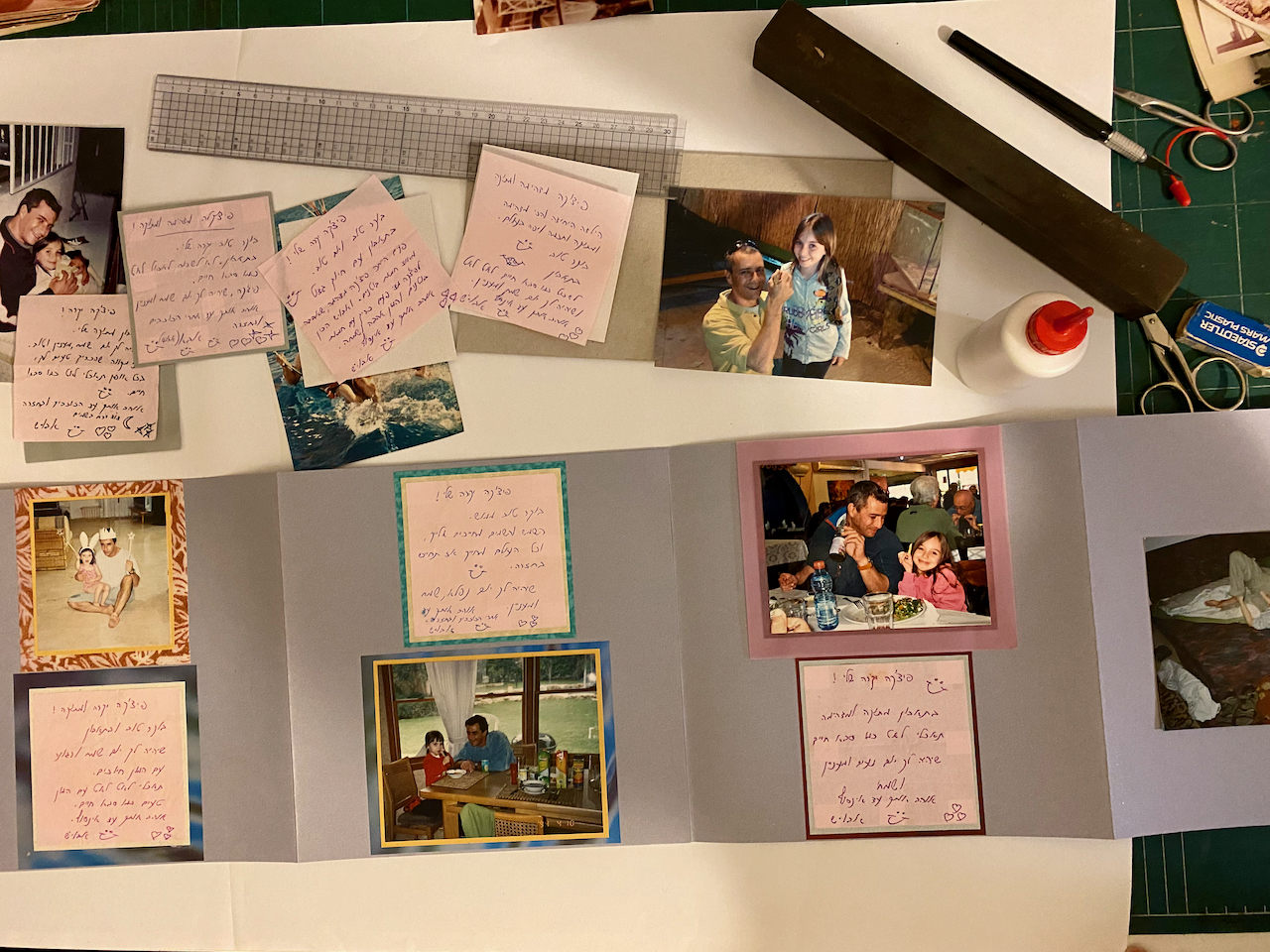 ההכנות הסתיימו והתחילה עבודת העיצוב שאני כל כך אוהבת. ניירות צבעוניים ורקעים עם דוגמאות מקשטים כל תמונה: מצד אחד זה אקורדיון עם זכרונות ילדות ומצד שני אלו זכרונות מאדם שאיננו עוד. קו דק בין עיצוב שמח של יום הולדת לבין עיצוב קודר לזיכרון והנצחה. עדיף איפוק בגודל המסגרות ובצבעוניות.
