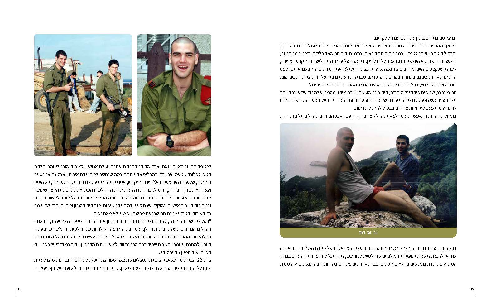 קיבלתי את הטקסט לספר מסופרת צללים שהוציאה איתי עד היום הרבה ספרים מצויינים, יעל מירון. יעל ערכה ראיונות רבים, פגישות עם ההורים ענת ובני, ופגישות נוספות עם דקלה, חברים של עומר מהקיבוץ, החיים והעבודה. קיבלתי טקסט שכתוב מעולה, ועברנו לעיצוב. בספר הזה בנוסף למחשבות שלי על ״מה צריך״ ולרעיונות המצויינים של המעצבת מיכל אקרמן, בורכנו בענת, שרגישה לנוף, לצבע, לאסתטיקה ונקיה מכל גאווה. ענת מכירה את עומר כמו שרק אמא יודעת, ביקשה מציירת בקיבוץ שובל לשלוח ציורים ייעודיים לספר, מה שתרם את האופי הראשוני. מיכל המעצבת דאגה שהטקסט שיעמוד נכון, ועם התמונות הדפים נראים מעולה, מעניין לקרוא, עדין ומכובד.