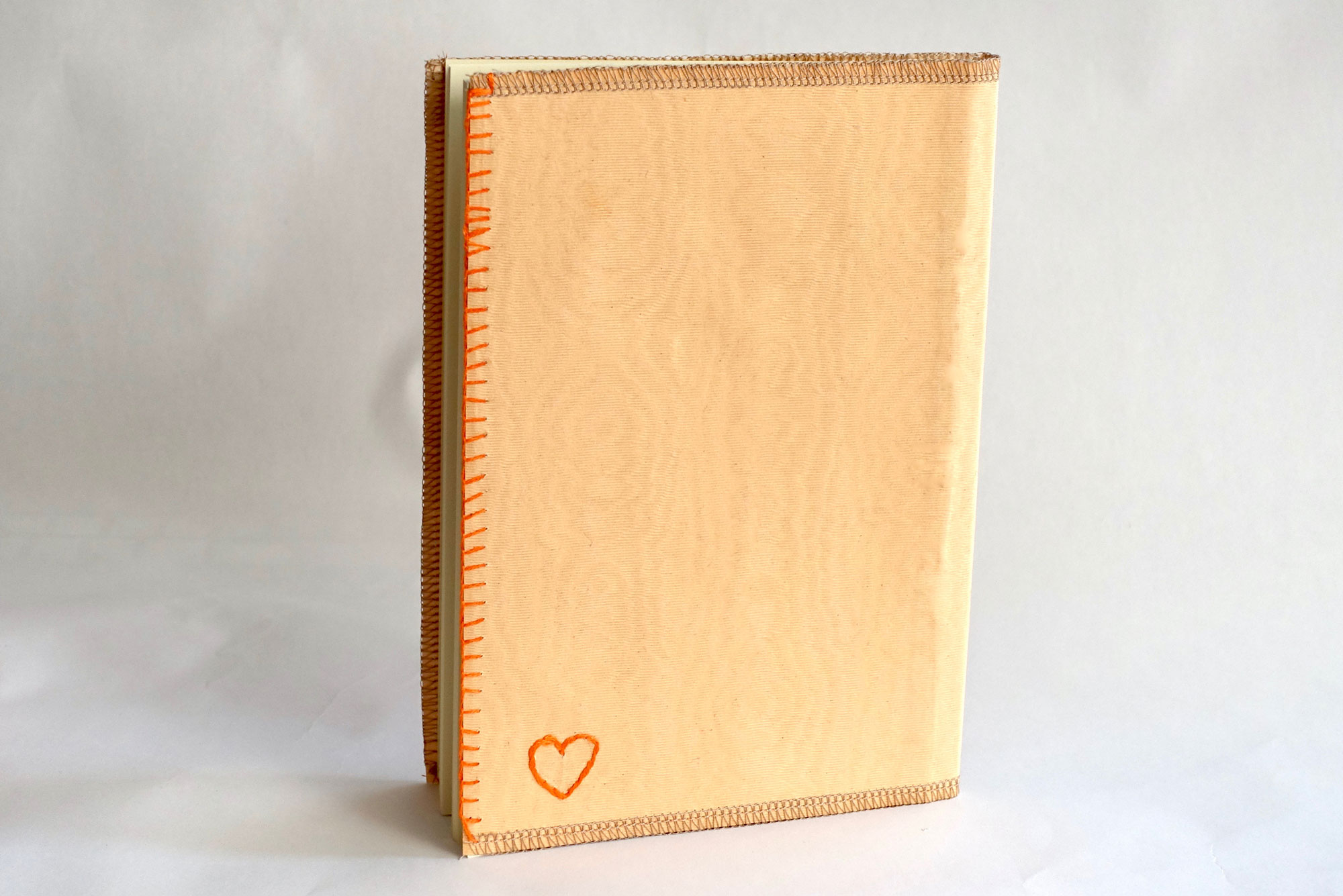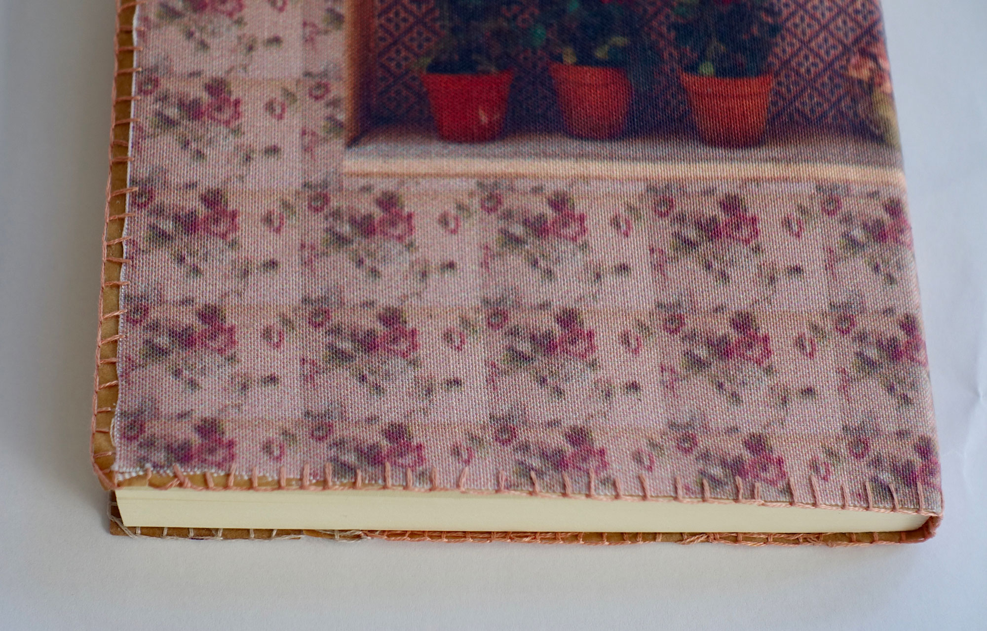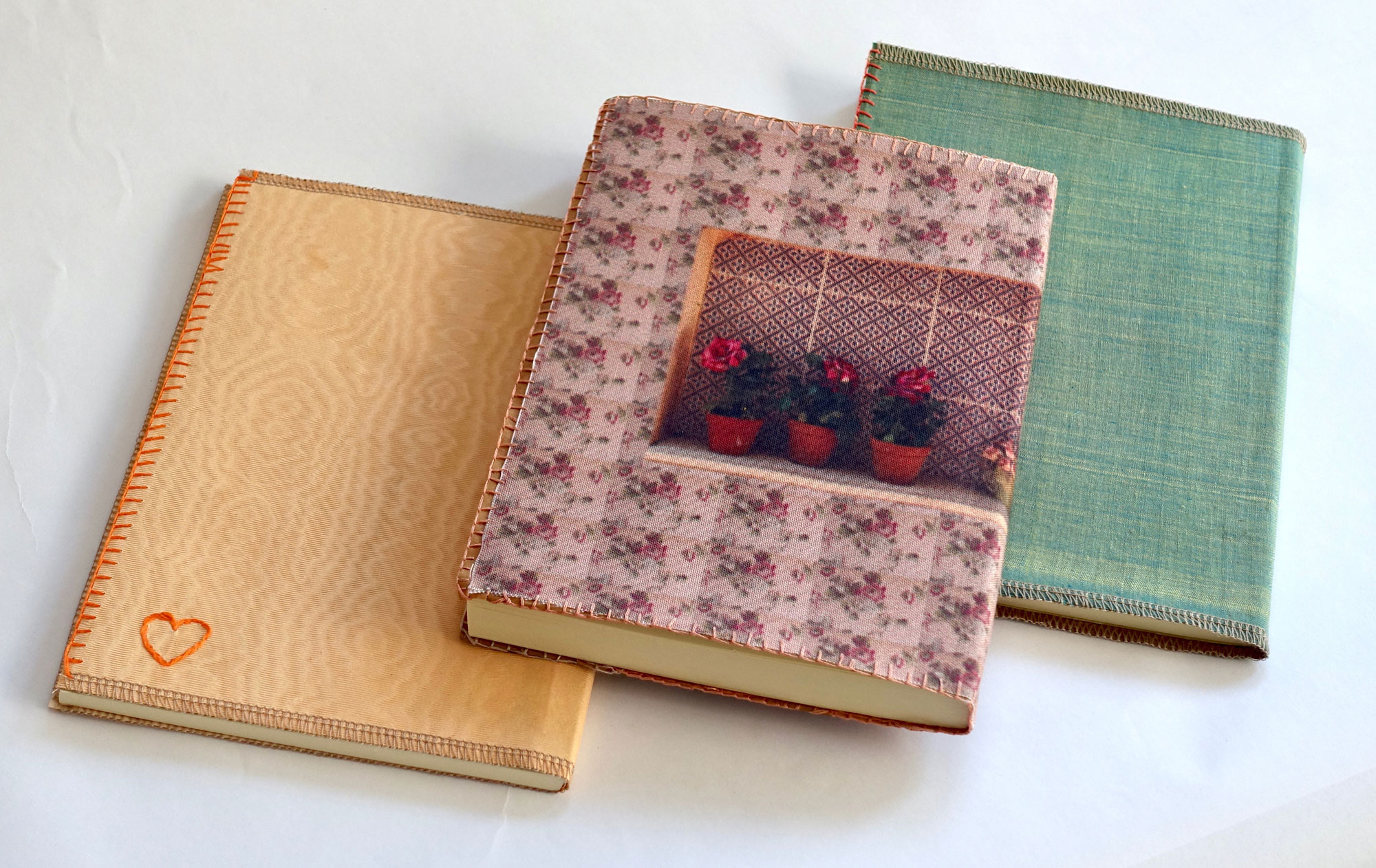 המחשבה היתה לא להכביד עם קרטון בכריכה ולכן מצאתי פתרון לסיומת הבד כדי שלא יפרם בשימוש – ב-3 פאות המחברות זכו לתפירת אוברלוק במכונה מסביב שמהדקת את הבד לנייר שמתחתיו – ובפאה הרביעית, בחזית של המחברות – תפירה בריקמה צבעונית שתואמת את הצבעים של הבד ונותנת אופי שרק בעבודת יד אפשר להעביר.