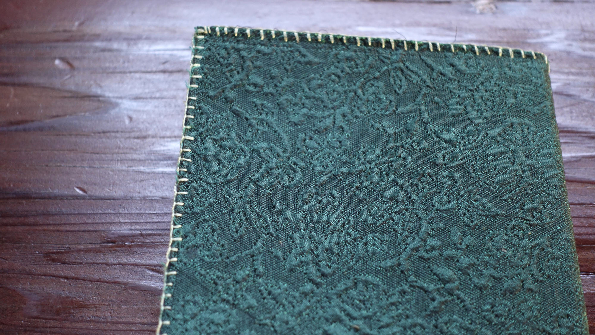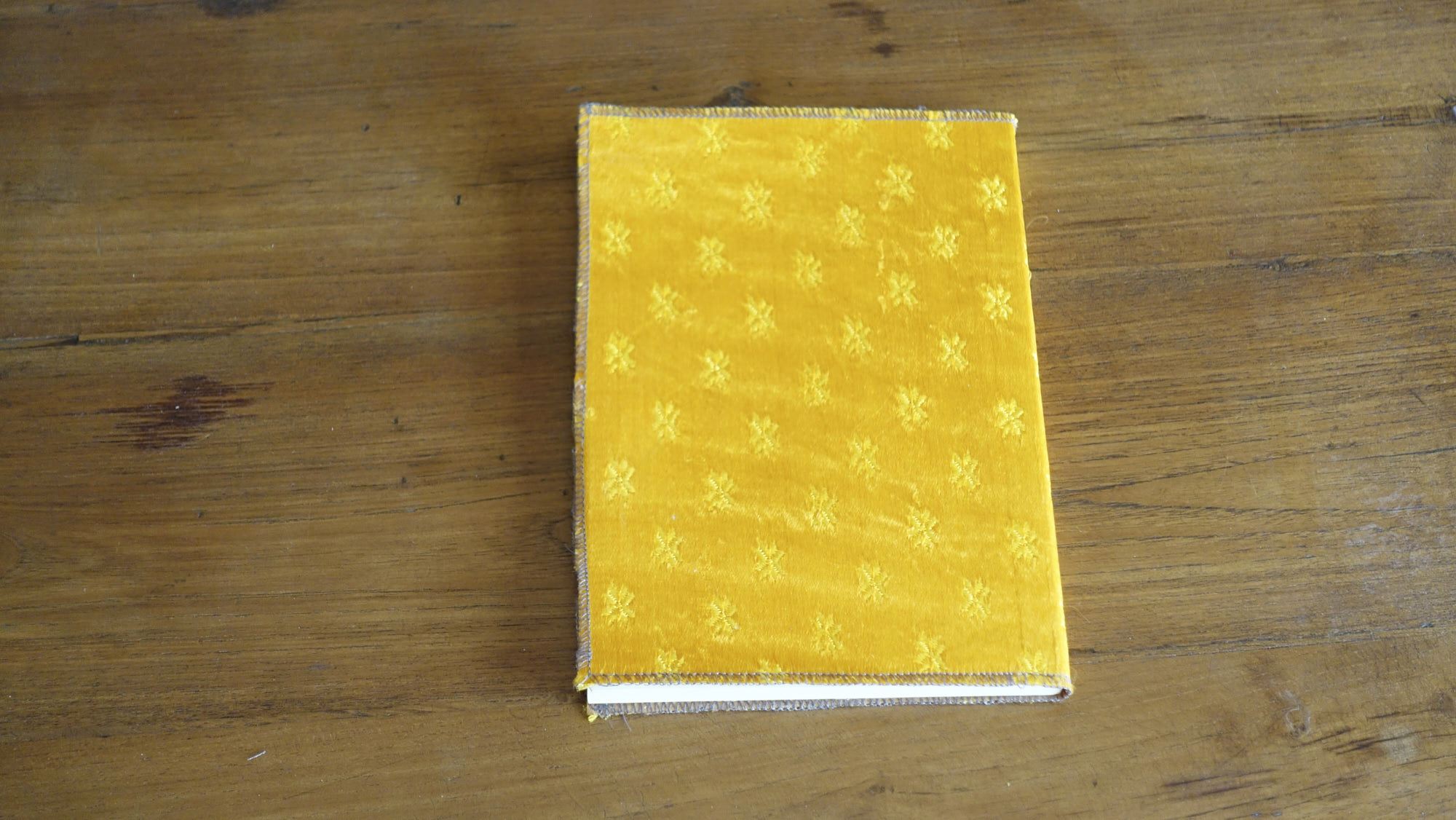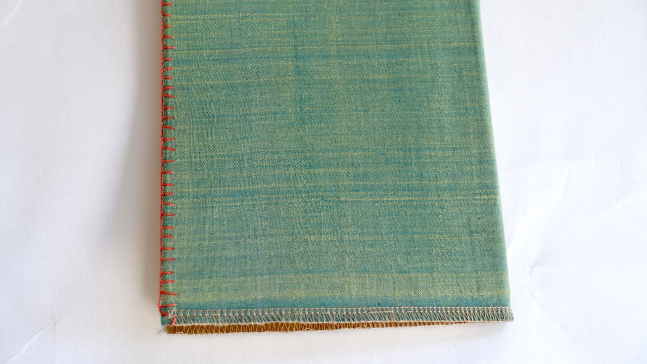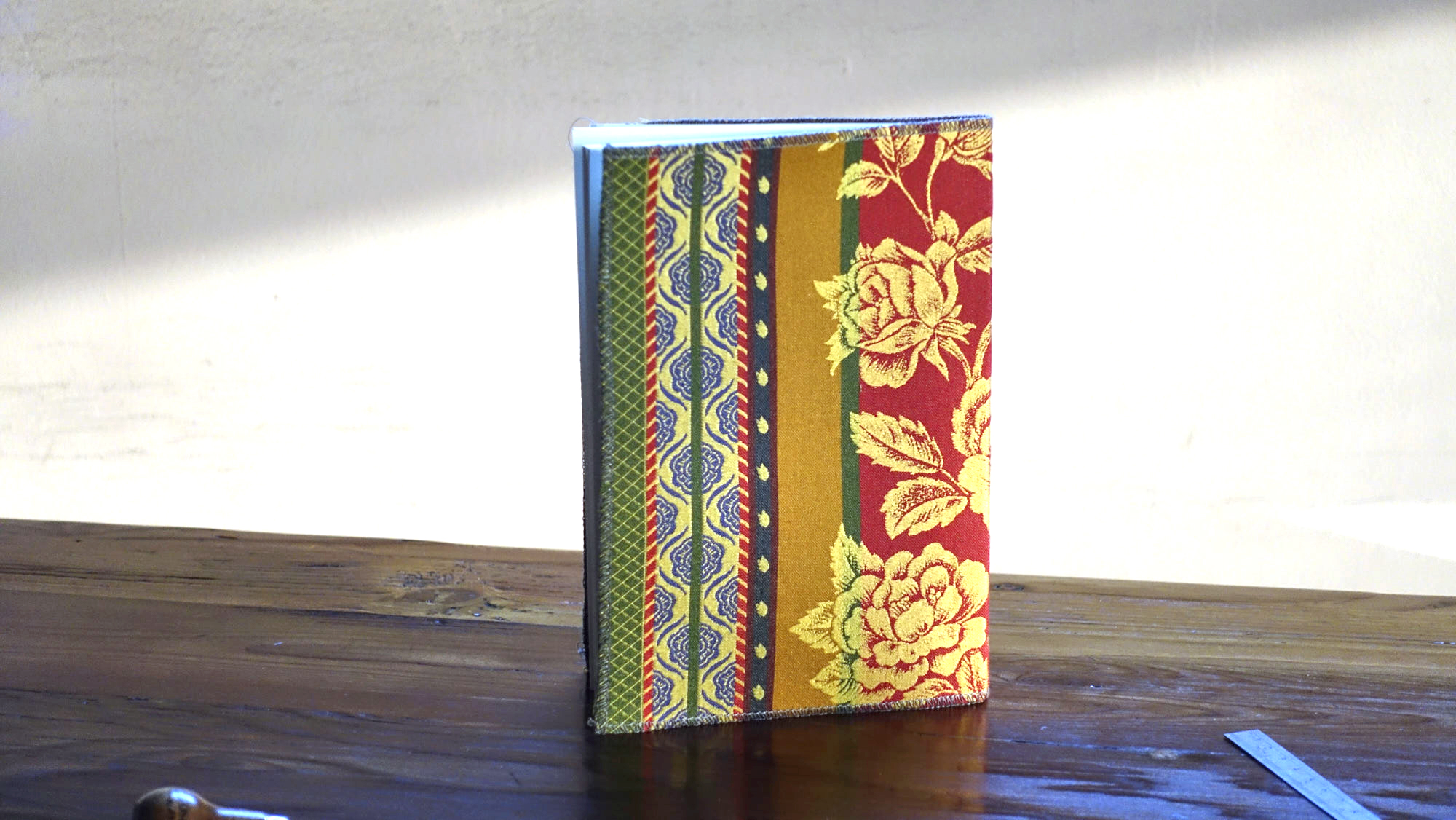 המחשבה היתה לא להכביד עם קרטון בכריכה ולכן מצאתי פתרון לסיומת הבד כדי שלא יפרם בשימוש – ב-3 פאות המחברות זכו לתפירת אוברלוק במכונה מסביב שמהדקת את הבד לנייר שמתחתיו – ובפאה הרביעית, בחזית של המחברות – תפירה בריקמה צבעונית שתואמת את הצבעים של הבד ונותנת אופי שרק בעבודת יד אפשר להעביר.