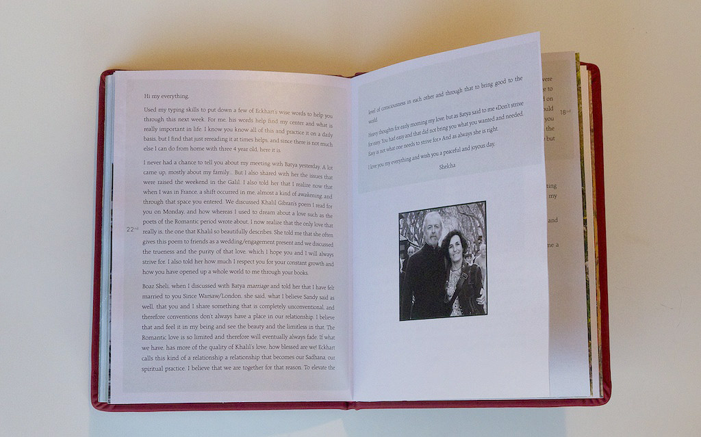 הכנתי ספר אהבה רומנטי, מיוחד במינו, שתוכנו אישי ומכיל סיפור יפייפה. גבר ואישה. אהבה ממבט ראשון או שני… עוזבים את השיגרה ומתחברים לעולם משותף רווי בחושניות ועוצמות רגשיות. תוכנו של הספר הוא המכתבים שלהם אחד לשניה. מיילים, הודעות טקסט ופתקאות שמכילות את הגעגועים והכמיהה כשהם נפרדים לכמה ימים. התמונות מעטות כי לא צריך הרבה כדי לזכור רגעים קסומים. התפתחות האהבה שלהם.