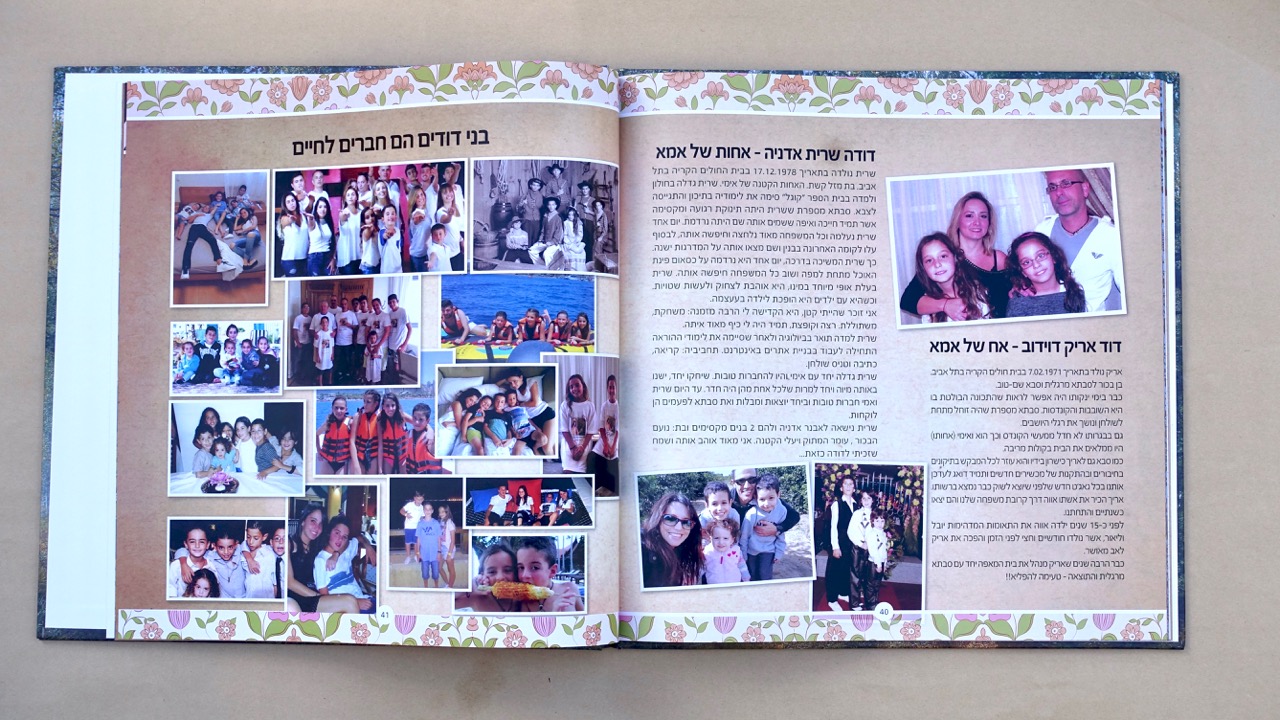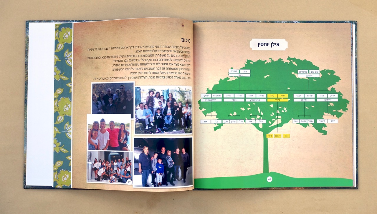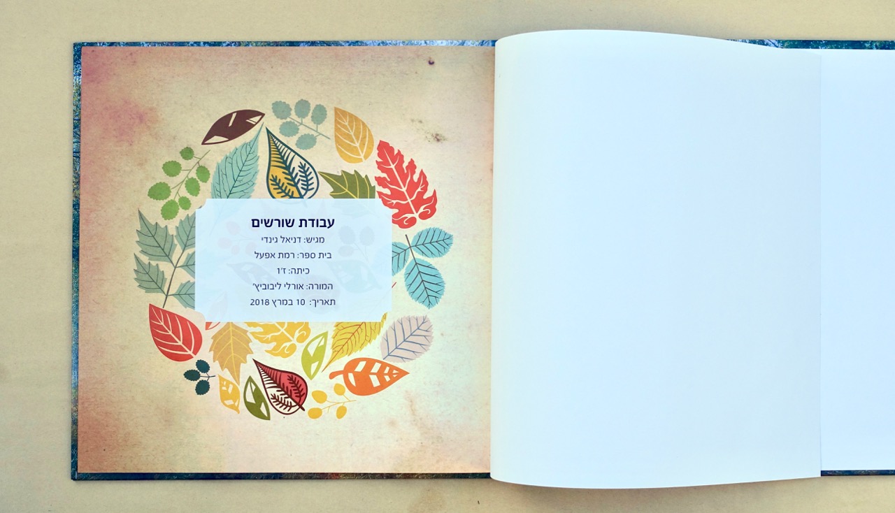 כשהחומר גלם מוכן – הטקסטים, הלינקים למסע העליה ארצה, עץ המשפחה, תמונות – כשכל זה מוכן באים אלי עם החומר. אנחנו מתחילים להעמיד את כל החומר בתוכנה הגרפית שלנו. כל עבודת שורשים שונה מהשניה – משפחה אחת מעדיפה צבעוניות שונה ממשפחה אחרת שמעוניינת בתשומת לב על הטקסטים יותר. כל עבודה נראית אחרת לפי סיפור המשפחה ולפי טעם התלמיד.