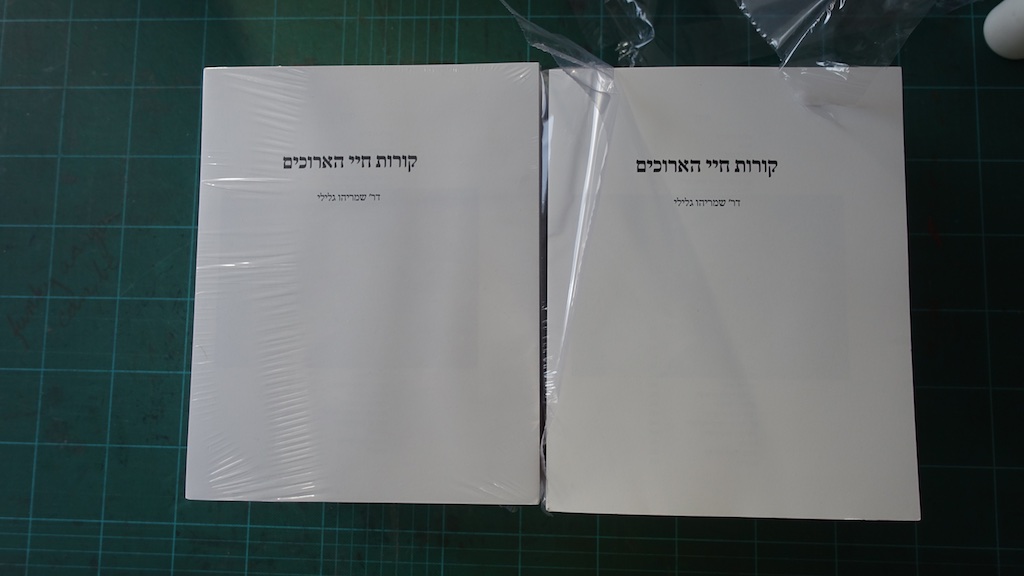 הספר הודפס על ניר מעולה מסוג ׳מונקן׳ – ניר חלק ונעים למגע, מט. דפי הספר ניתפרו ביסודיות והעובדה שהשארתי מספיק מקום בשידרה נותן לספר אפשרות להפתח באופן כמעט שטוח למרות עוביו – 300 עמודים!!!