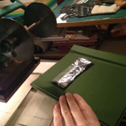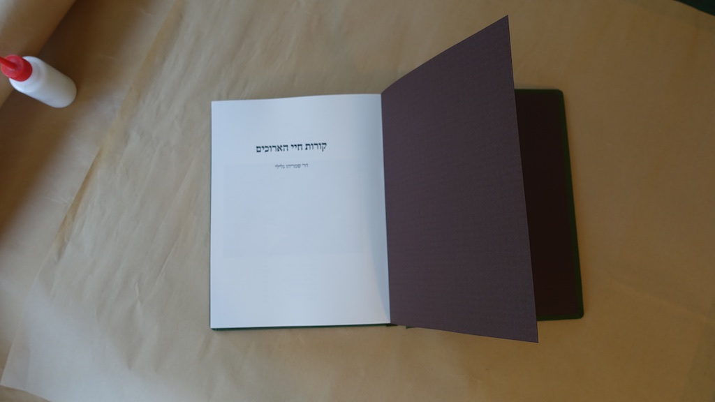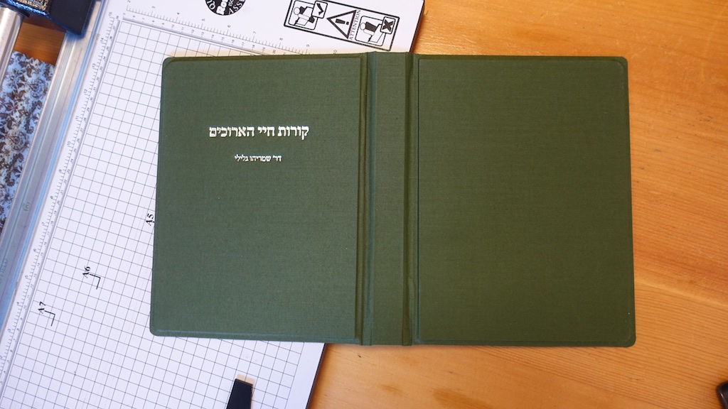 את הכריכה עטפתי בבד ירוק והניר שמחבר בין הבלוק והכריכה בצבע חום מיובא מאיטליה, ניר מנופח בעובי 300גרם. הצלחנו לבצע את ההטבעה אחרי אין ספור נסיונות ולשמחתי כשרואים את הספר לא חושבים על כמות העבודה שהושקעה בו – קודם כל הספר צנוע, לא ענק ממדים וכאילו אומר ״ באתי לספר סיפור״ לא להגיד לכם כמה אני מעוצב יפה…. גם זאת הצלחה.