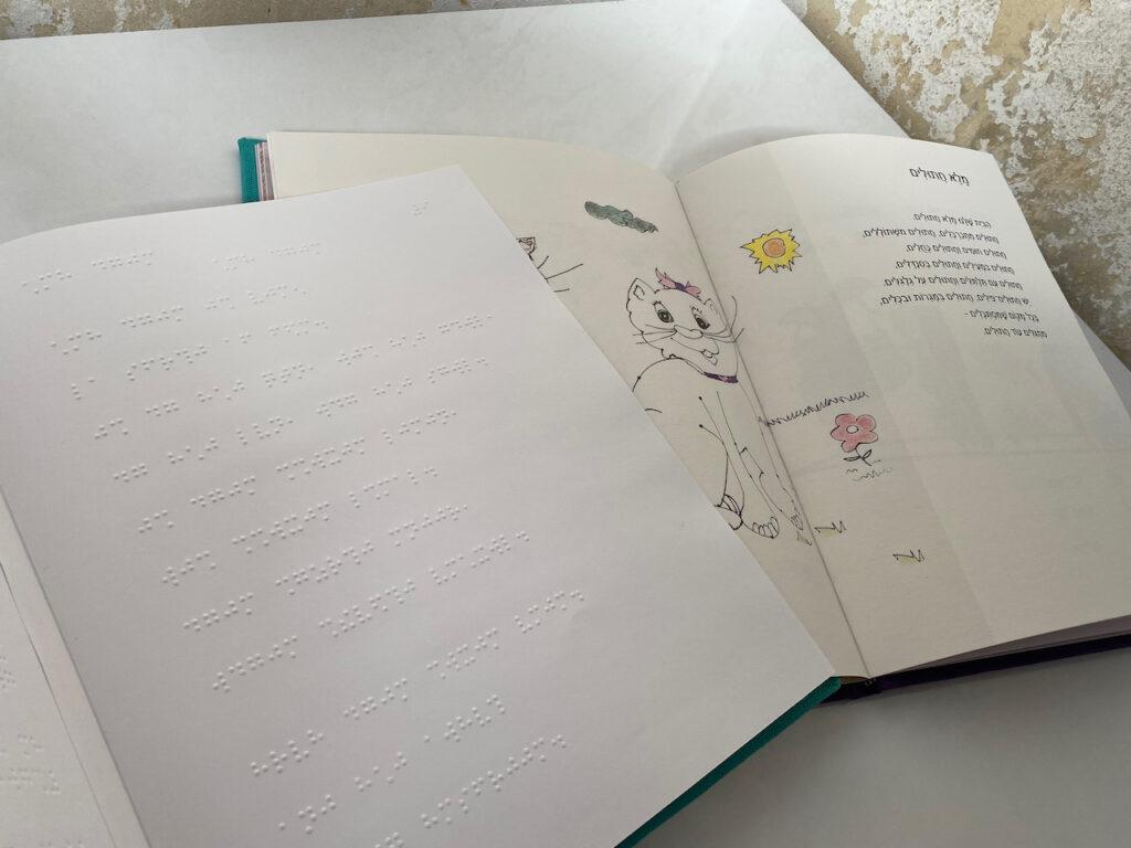 סירטון וידיאו שמראה ספרי שירה לילדים עם ליקויי ראיה, ביוזמת ורוניקה אלרן, במסגרת ״חשים אמנות״